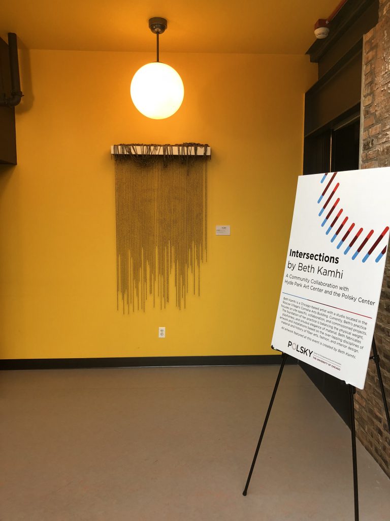 The art opening on November 1 featured Kamhi’s signature industrial bead chains, which have been displayed in many other facilities around the Chicago area. Kamhi participated in The Center Program at Hyde Park Art Center five years ago as an artist in residence and has stayed in touch with the center since then. When the Polsky Center announced that it was accepting proposals for its art installation project as part of the partnership with the Hyde Park Art Center, Kamhi heard about this opportunity through the art center and jumped right in.