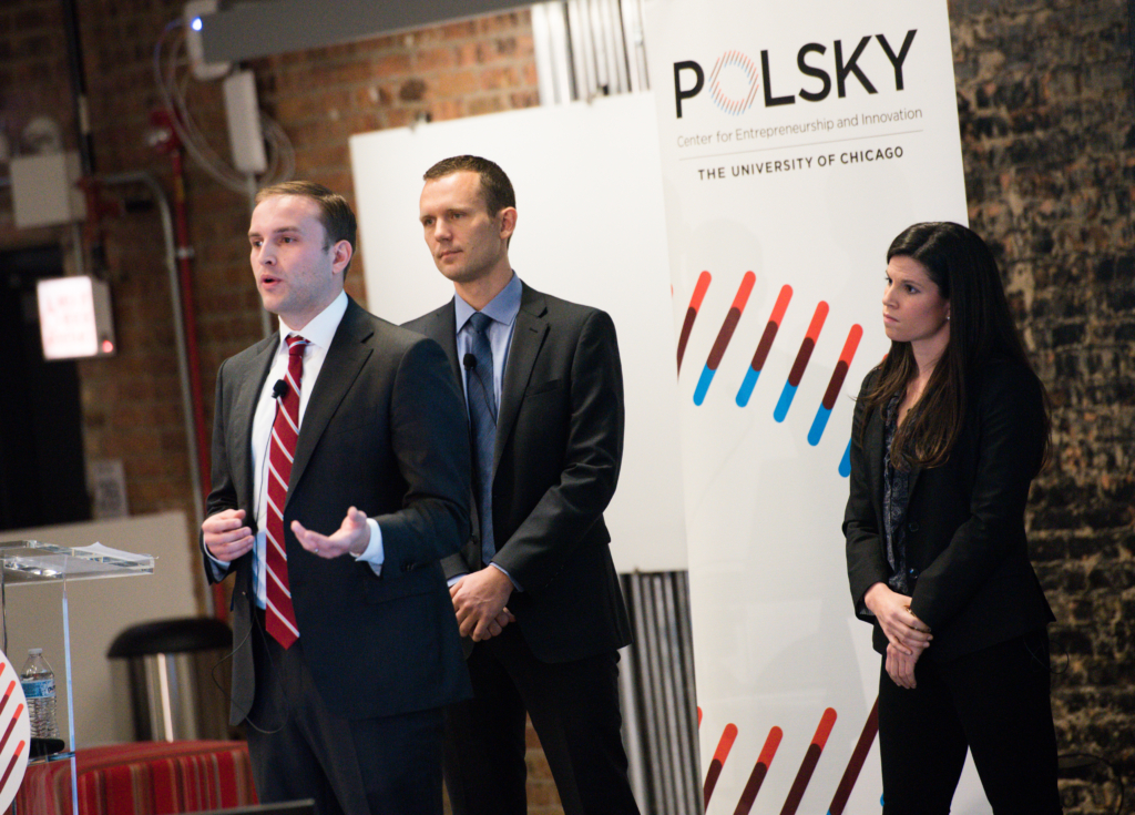 Four finalists presented their proposals to the Innovation Fund advisory committee, which includes leading investors and entrepreneurs from a variety of technological and scientific fields, at the Fall Finals on Thursday, December 6. Over 180 students, faculty, alumni, and members of Chicago’s entrepreneurial and investing community listened to teams present their biotechnology ideas ranging from infection prevention using technology that collaborates with the microbiome to developing a smart baby bottle system and improving patient care to an MRI software tool.
