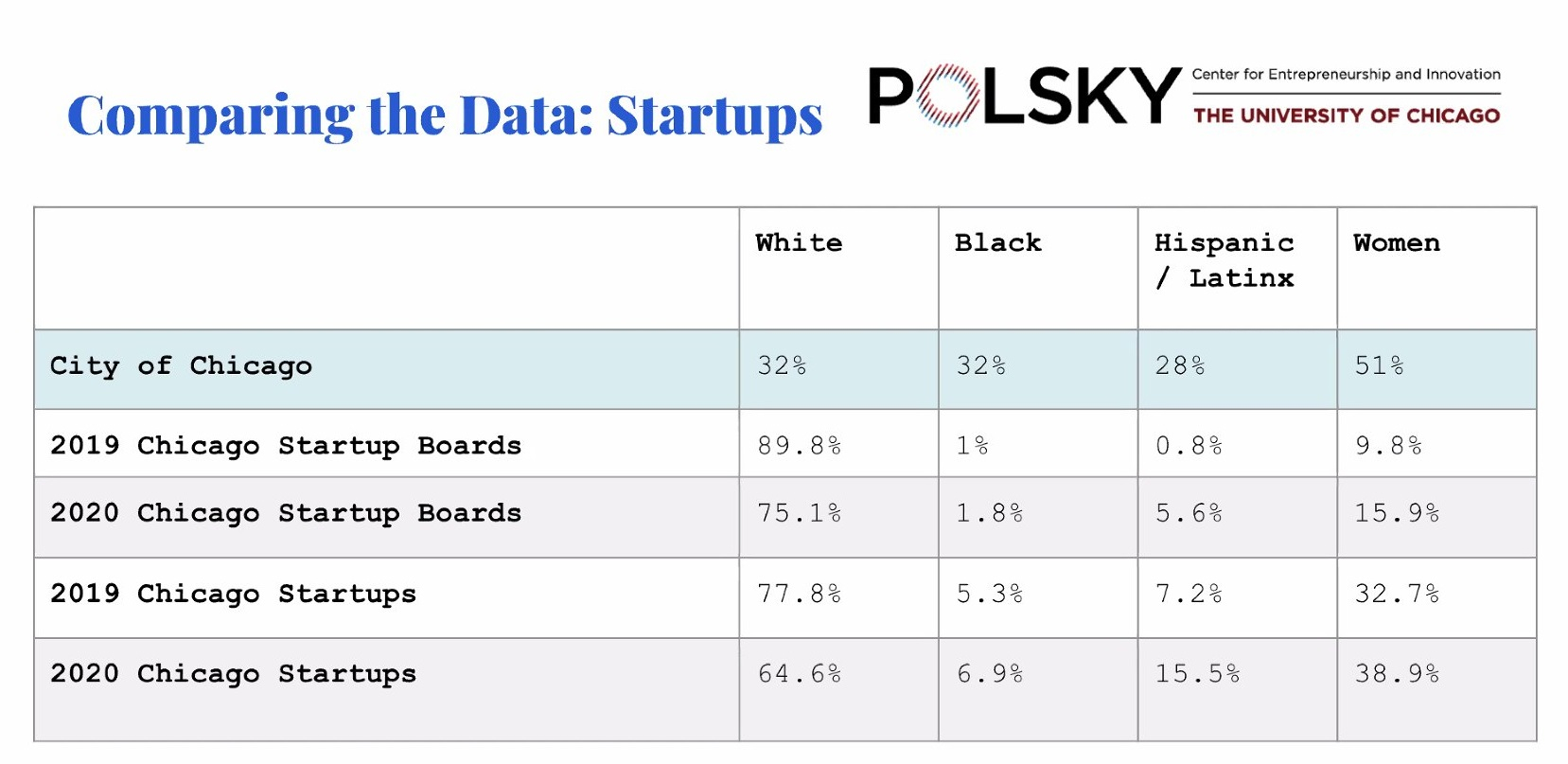 The Polsky Center for Entrepreneurship and Innovation partnered with Chicago:Blend, an organization dedicated to bringing diversity to the Chicago business sector, to compile data on Chicago’s increasing diversity in startups. Findings were presented in a virtual town hall event on Tuesday, January 12 (view recording below).
