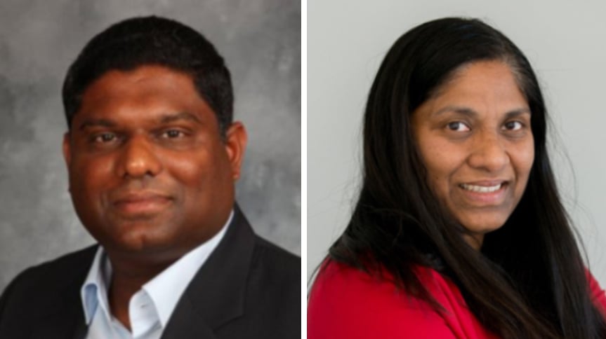 Chuck Vallurupalli, MBA ’05, (left) has been named the inaugural senior director of Duality and Preeti Chalsani, PhD, (right) will take on a new role of deputy director of Duality in addition to her current duties as director of industry partnerships for quantum information science.