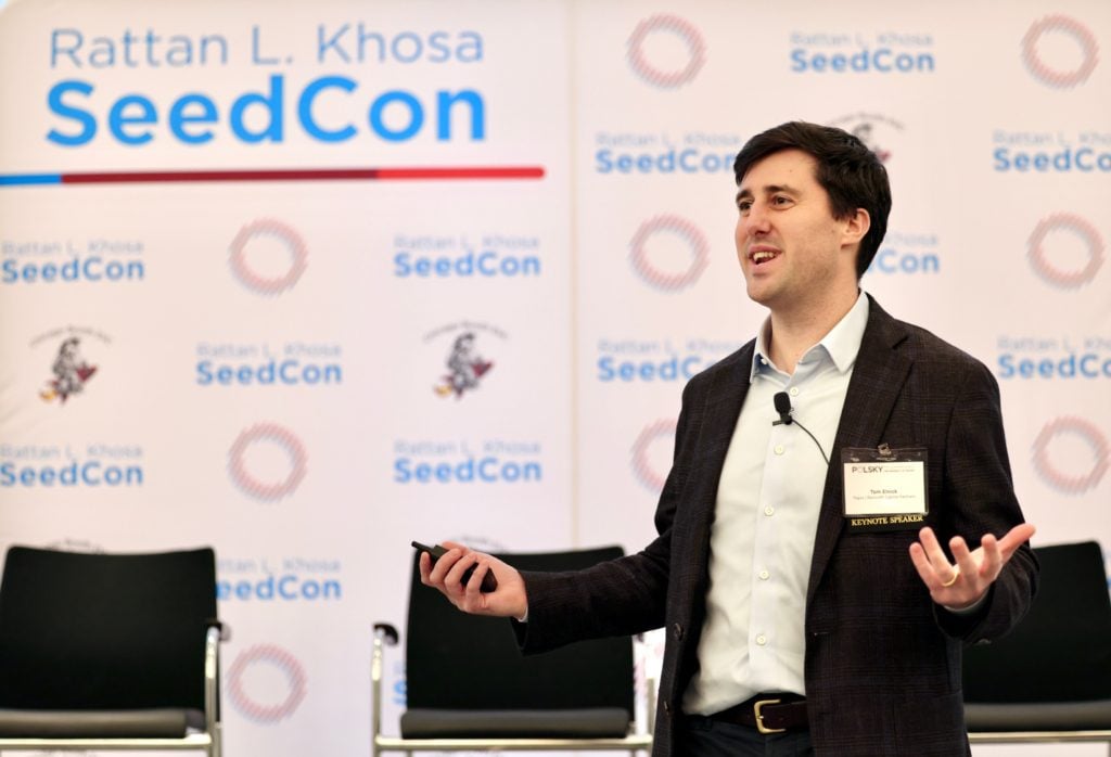 Tom Elnick, former cofounder and co-CEO of Tegus and partner at Bancroft Capital Partners, speaking at SeedCon.